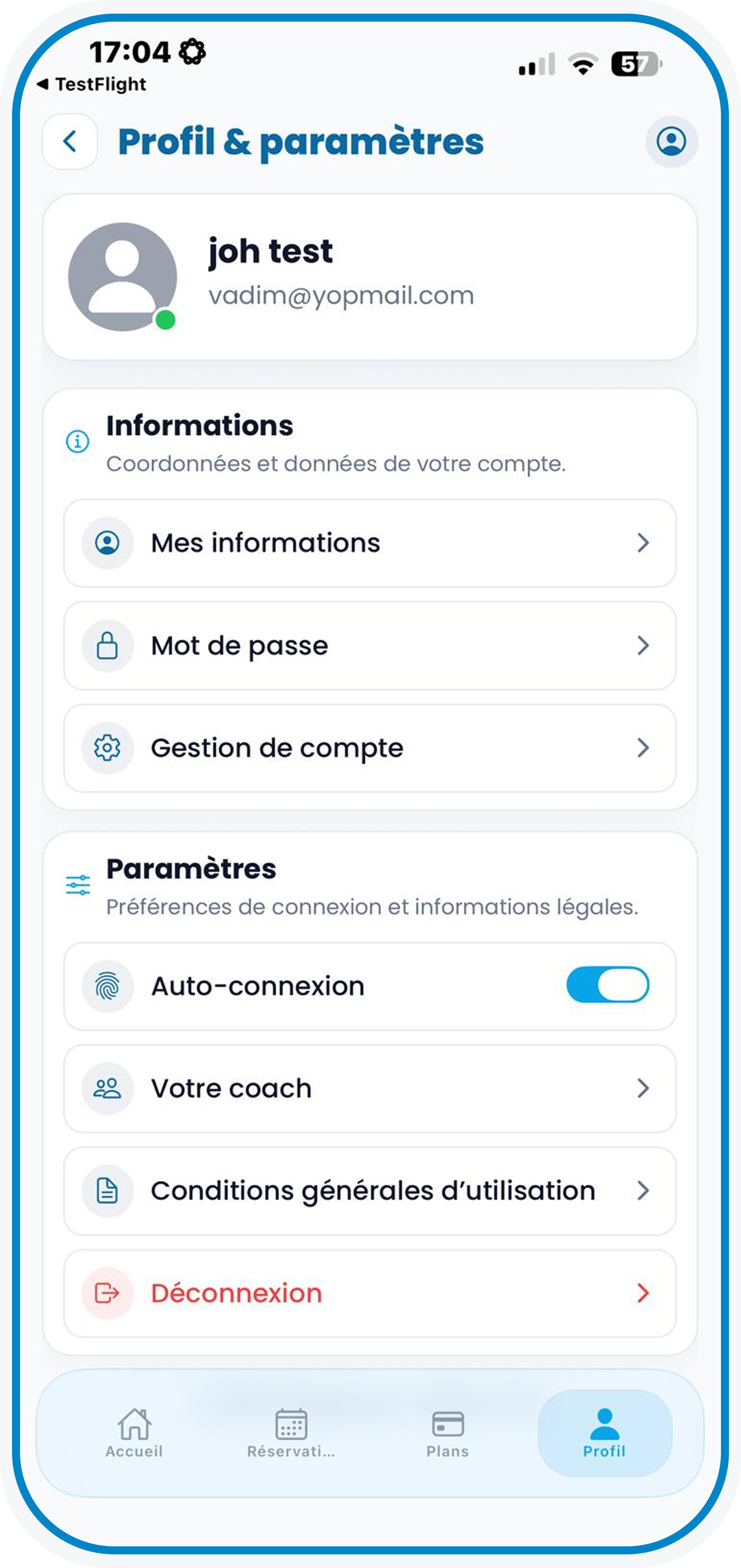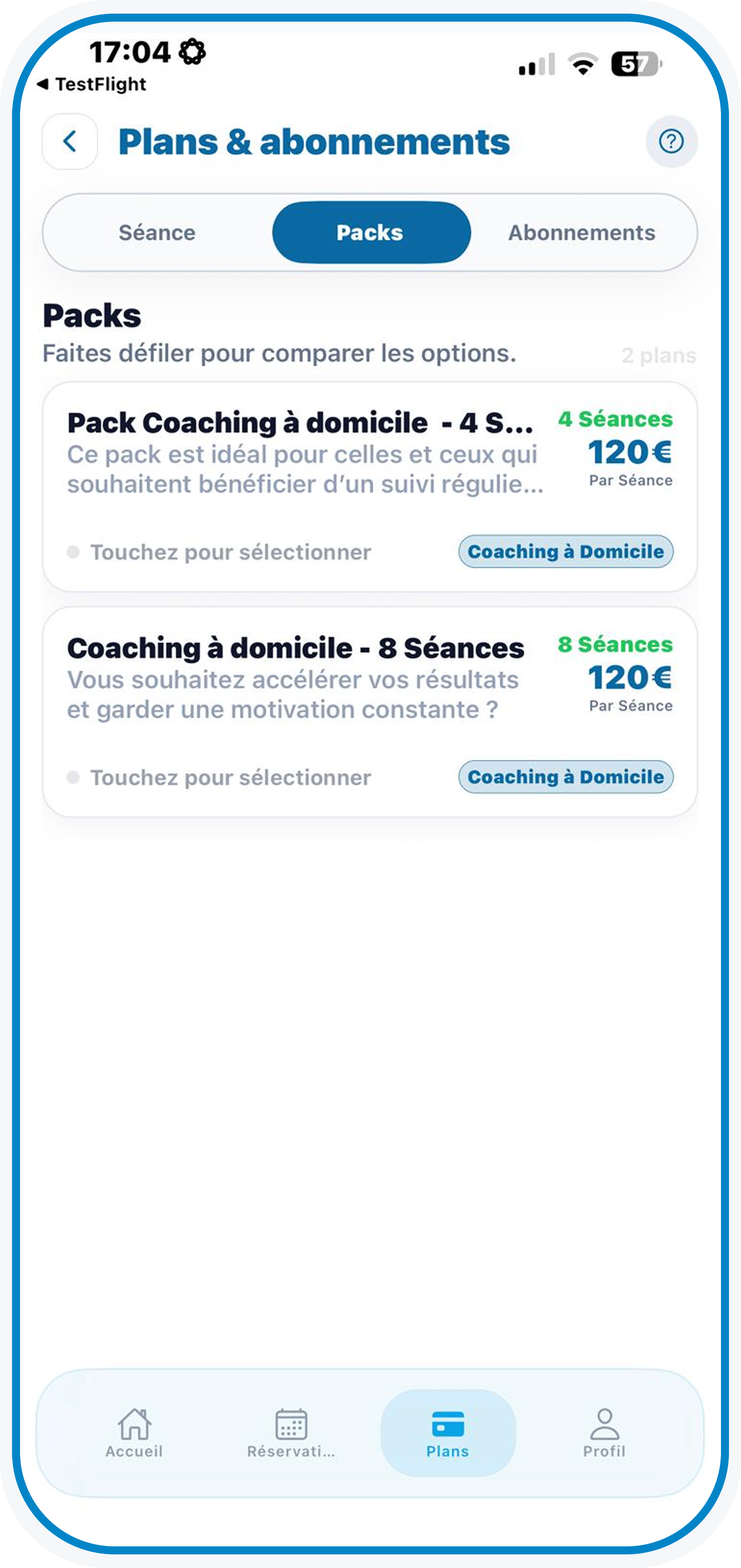 Rappels de séances, notifications automatiques et accès client dédié : vos clients restent engagés, sans que vous ayez à relancer manuellement.